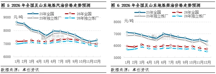 综合研判,预计2026年国内成品油价格或呈现先跌后涨再跌的阶段性走势,均值同比下滑。预计年内全国及山东地炼92#汽油批发均价或分别在6950-7350、6800-7200元/吨;全国及山东地炼0#柴油批发均价或分别在5700-6100、5500-5900元/吨波动。
