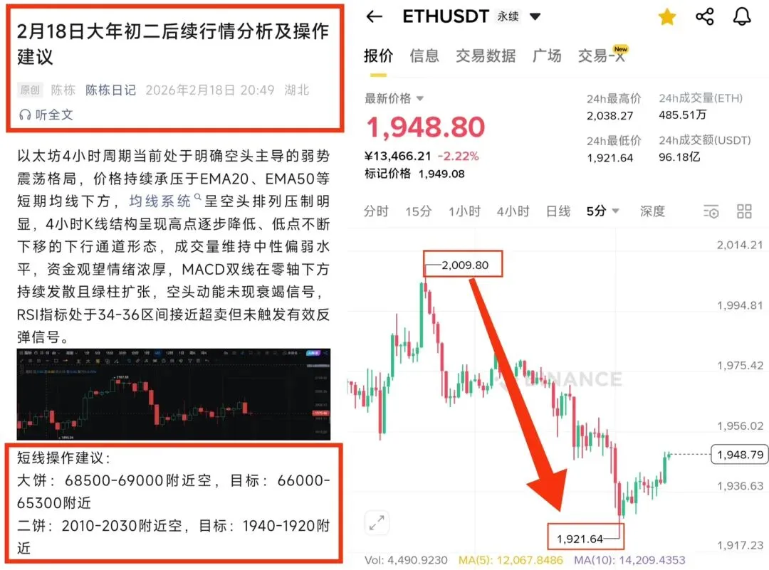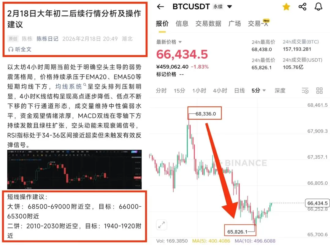 大家好我是你们的老朋友陈栋,新年新气象祝大家忘掉之前的烦恼,新的一年开始新的布局,我们先回顾下今日的行情:凌晨市场如期迎来深度下探,整体走势与晚盘预判高度契合,以太坊自2010关口承压回落,最低触及1920附近,单边回撤幅度超90点,比特币同步从68300一线快速下探至65800区域,回落幅度逾2500点,晚盘布局点位精准匹配市场波动,昨日整体交易布局实现稳健盈利;