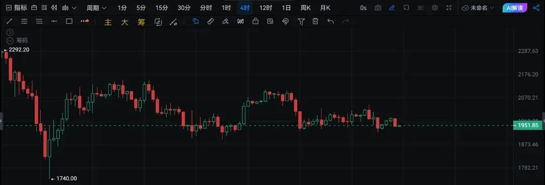 以太坊4小时周期呈现清晰的弱势收敛结构,阶段高点连续下移且关键阻力持续压制有效,价格波动区间由宽幅震荡逐步收窄为窄幅整理,量能同步萎缩、反弹动能持续衰减,整体构筑典型的偏弱震荡形态,此类结构往往是下跌中继的信号,后续行情大概率延续下行节奏并打开新的下跌空间。