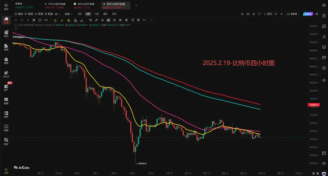 我们看四小时,蜡烛图依然在均线下面,属于空头,但是也跌不下来,说明支撑也强,耐心等待60000~65000之间的多单,65000附近可以轻仓介入,这是做多的方法之一;再就是等四小时均线金叉,并且蜡烛图不跌破均线,做多,多单的目标位在72000~74000之间。74000附近还可以考虑空单,耐心等待!