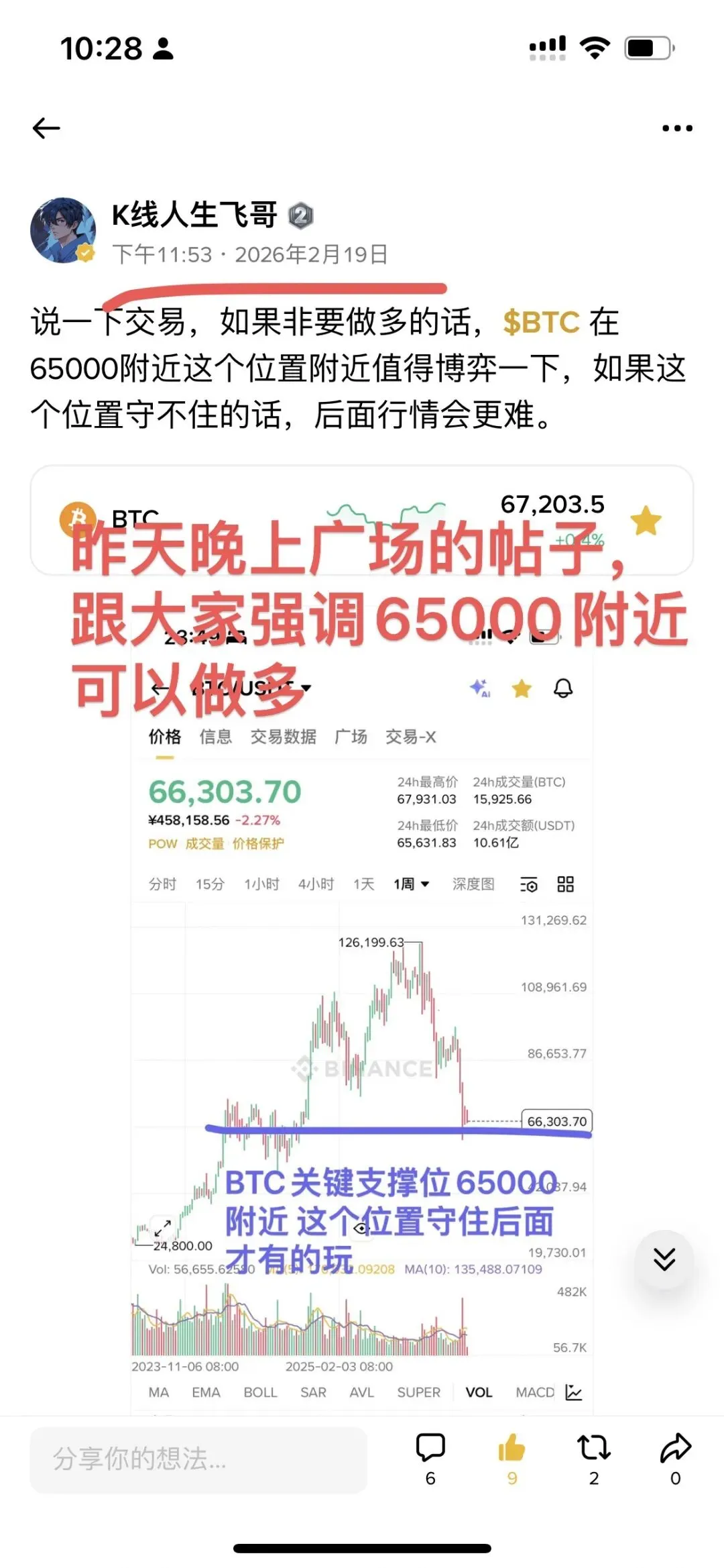 如果你每天非要跟着市场情绪走,反弹个一两千到就看多,跌个一两千刀就看空,那只又是被市场反复收割了,到时候又要骂这个市场又要骂KOL割韭菜,其实我觉得没有必要,关键点位和支撑都明确的告诉你,你自己不敢开单怪谁呢?或者说自己乱操作一通亏麻了,然后到了真正的机会又不敢了,主要还是心态问题,放平心态吧。短期只要65000这个位置能守住,后续还是能看反弹到72000和75000的。