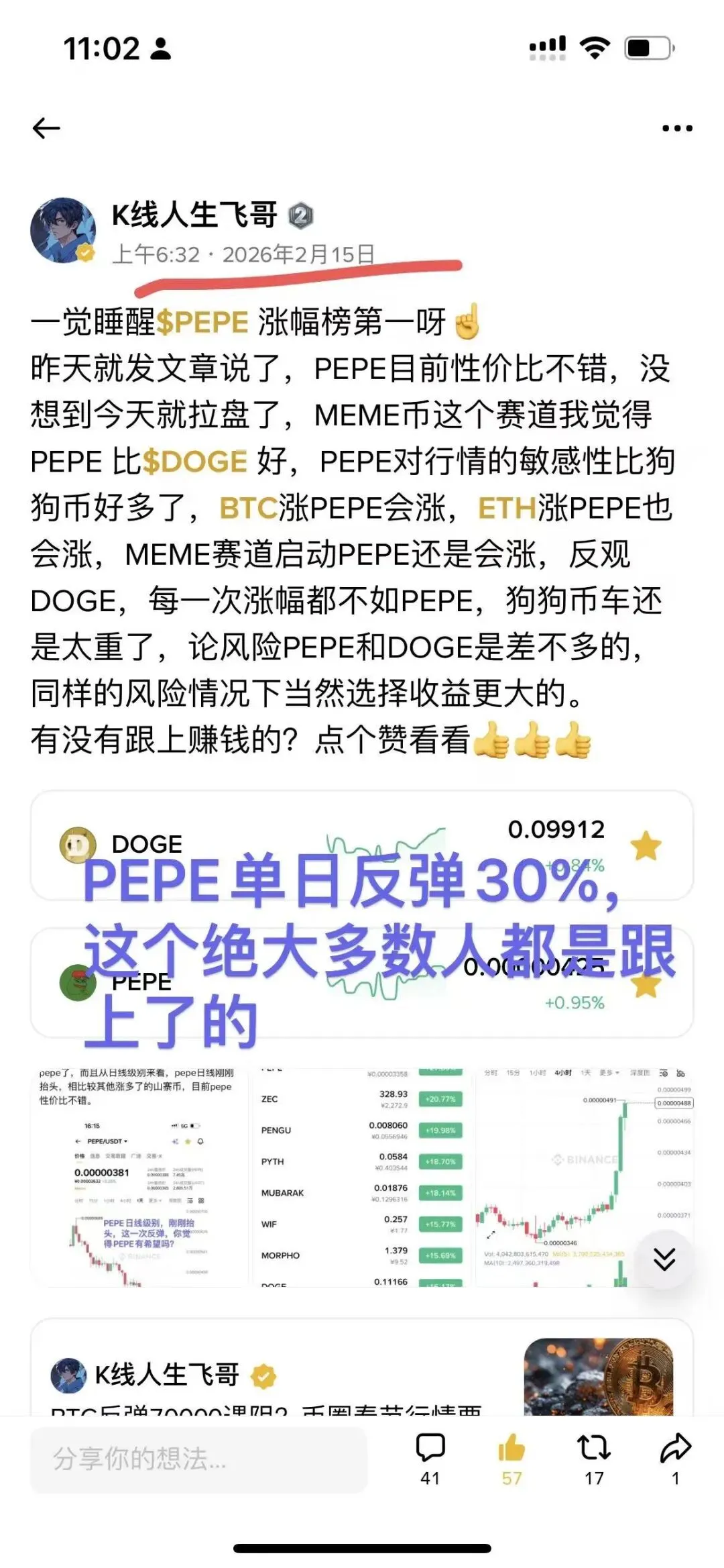 PEPE也反弹了30%,这个是很多人都跟上吃肉的