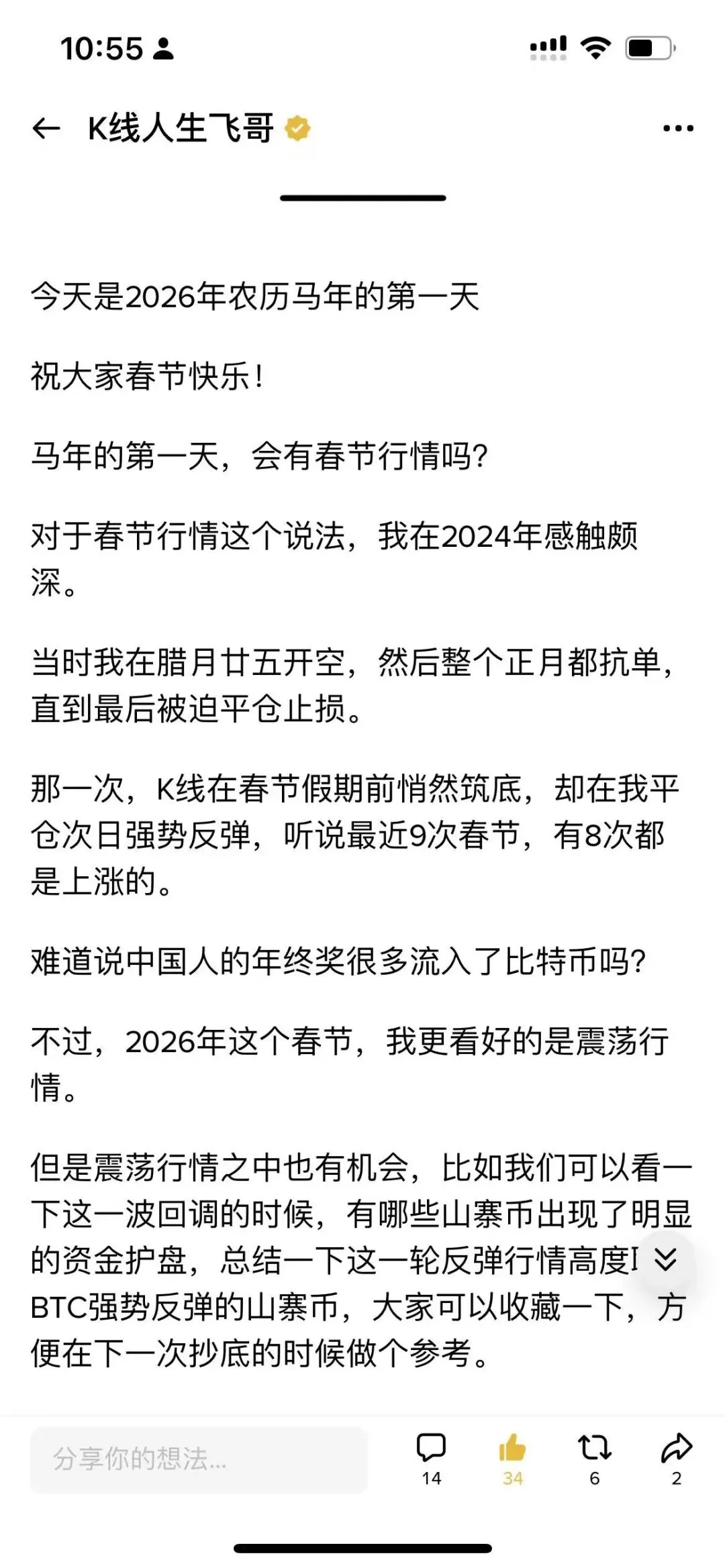 而且大年初一我就专门发了文章,春节期间可能是震荡行情,然后昨天有人在我评论区开喷,说你说有春节行情我他妈又爆了,大过年的我不想骂人,自己阅读理解能力不行就去多学习多看书,况且这几天市场就是来回震荡,我说的没病没有毛病也没有说错。