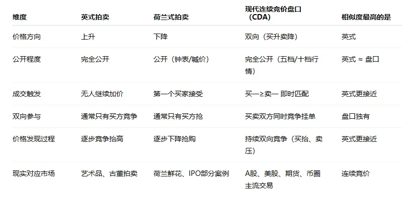 因此,英式拍卖与连续竞价市场的盘口动态最相似,尤其是买方竞争推动价格上涨的机制非常接近。