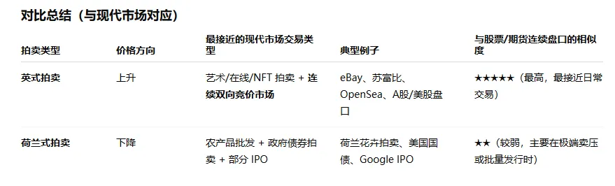 所以荷兰式拍卖更像极端卖压下的瞬间快照,或某些集合竞价/批量撮合机制的简化版,所以集合竞价时的差异程度往往能体现当日的总体力量方向,但与日常连续盘口的双向实时竞争差异较大。