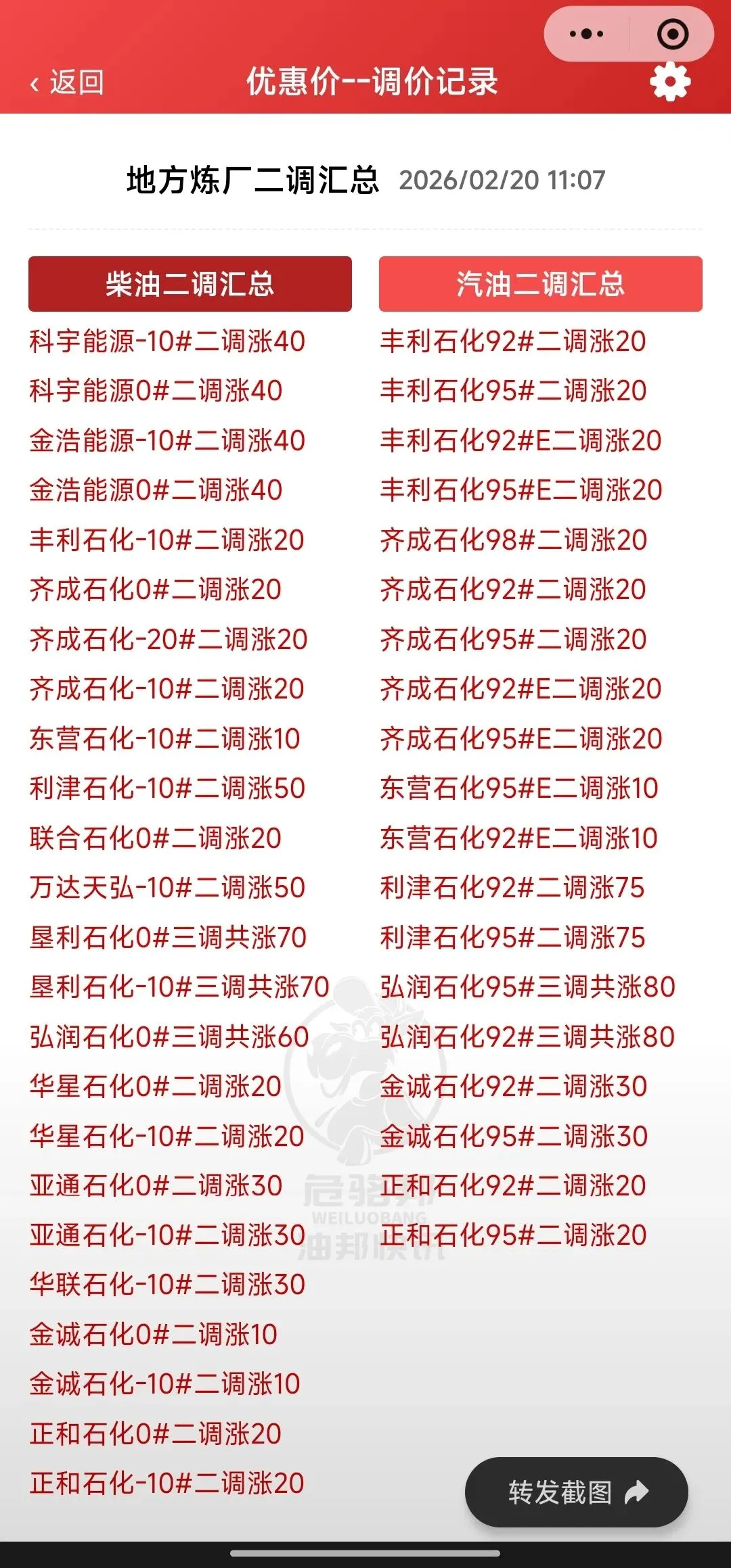 危骆邦油邦快讯|2026.02.20山东地炼油价播报📢