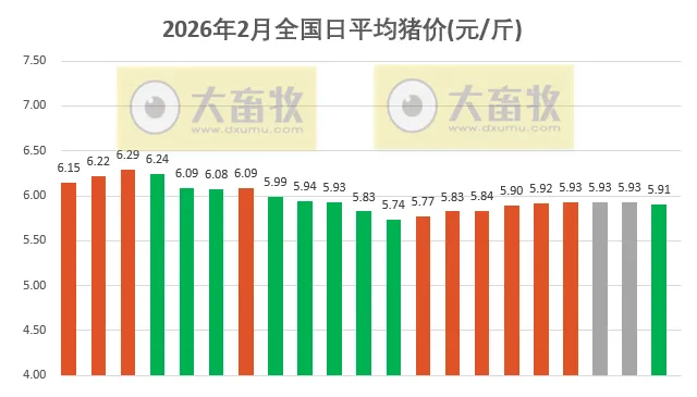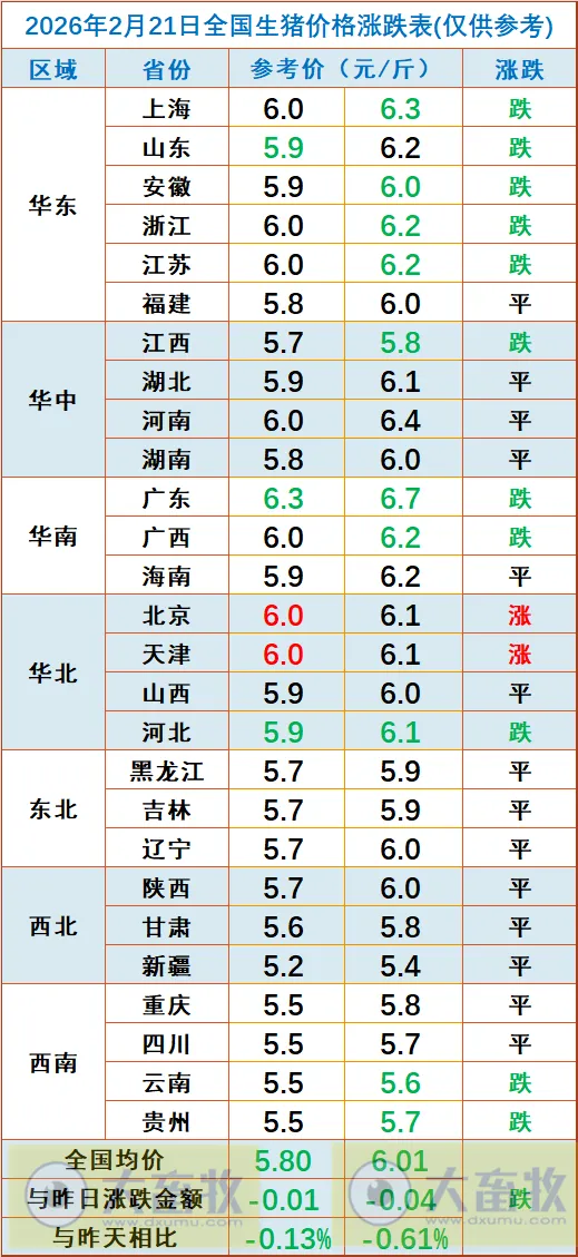 大畜牧小编根据我国27省的猪价数据,计算出2026年2月21日全国平均猪价为每斤5.91元,比昨天下跌0.02元,跌幅为0.37%,为近5天最低价;