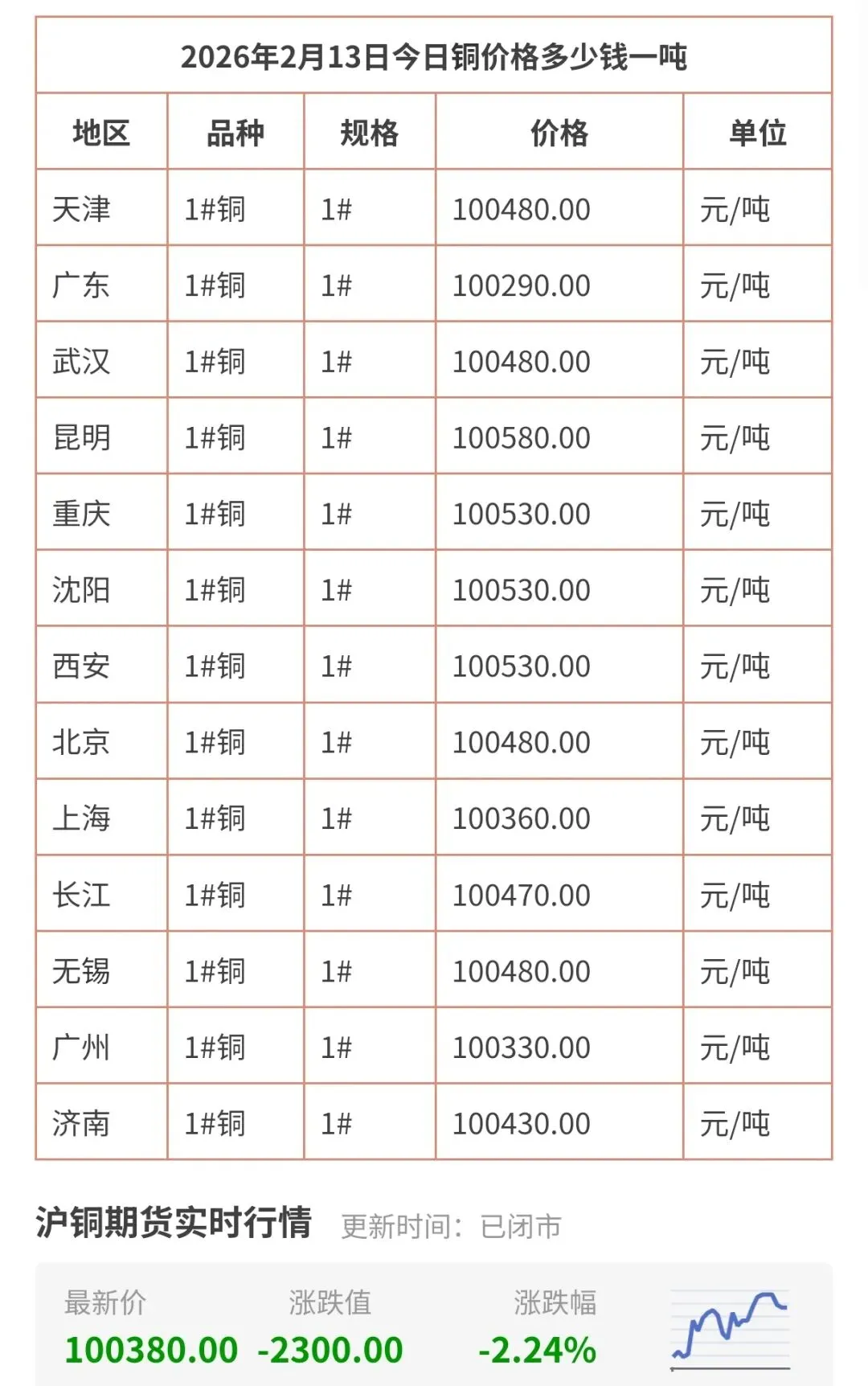2月20日更新,今天铜价实时查询!最新今日铜价格多少钱一吨,包括广东、武汉、昆明、西安、无锡、天津等地区现货铜价格