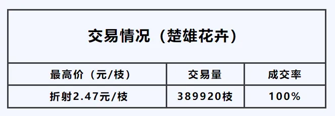 20日,姚安花拍中心全渠道交易总量约为494940枝,今日交易量较前一交易日增加,总体购买力下跌。成交率下滑,交易情况如下: