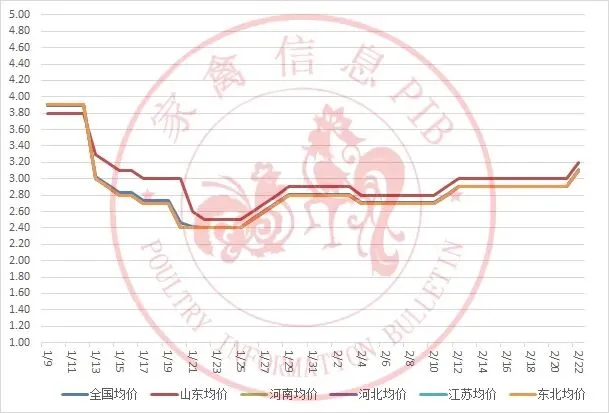 2025年1月9日-2026年2月22日主流地区白羽鸡鸡苗均价走势图