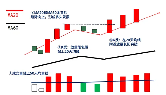 3)K线反转形态1:出现放量阳包阴形态,且股价依托该形态站上20天均线;