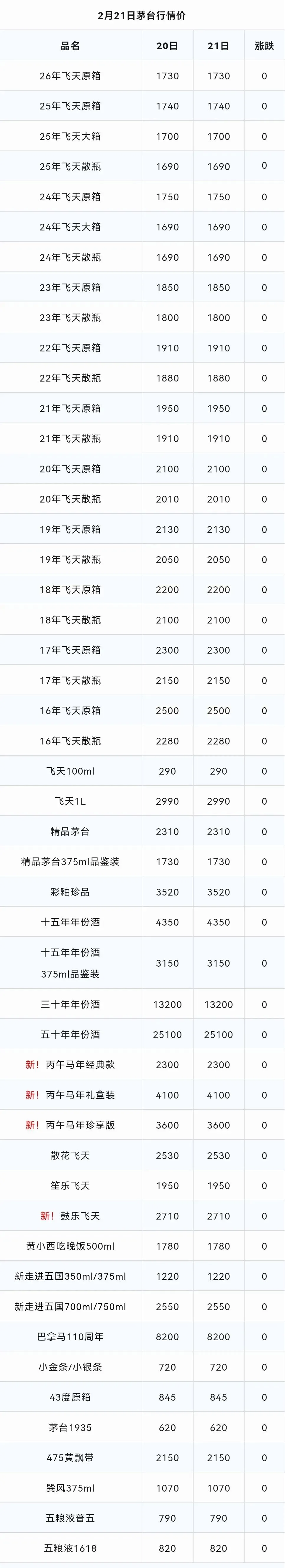 由于公众号平台修改了推送规则,如果不想错过“茅酒顾问”行情价,记得读完点一下“在看”,这样每次新文章推送才会第一时间出现在你的订阅列表里。今日(2月21日),从茅酒顾问发布的白酒价格行情监测数据显示,近段时间整箱茅台价格一直在1550徘徊,散瓶在1540左右,今日53度贵州飞天茅台(500ml)一批价跌至1740元左右!散飞在1690。