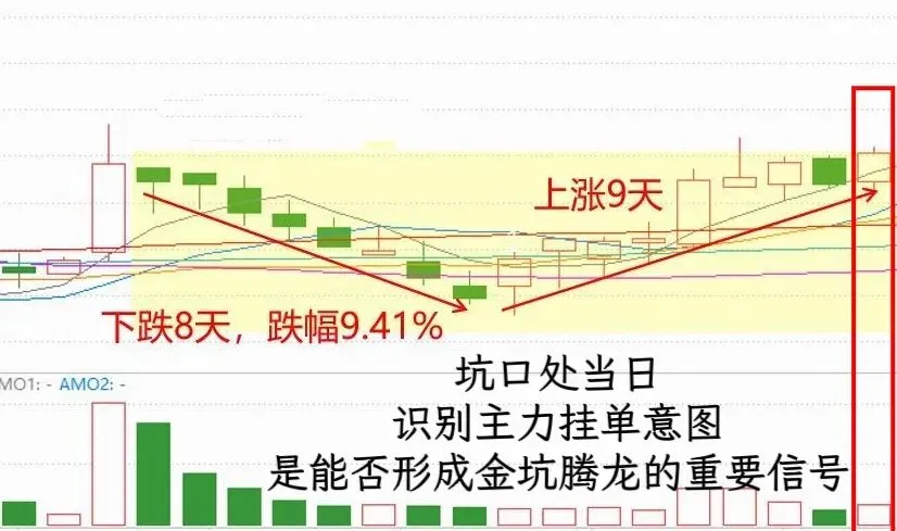 如在主力挖坑后,K线爬升至坑口处,这时候我们就要对分时盘口进行判断。主力在分时的挂单表现,就是走出金坑腾龙量价模型的重要依据。