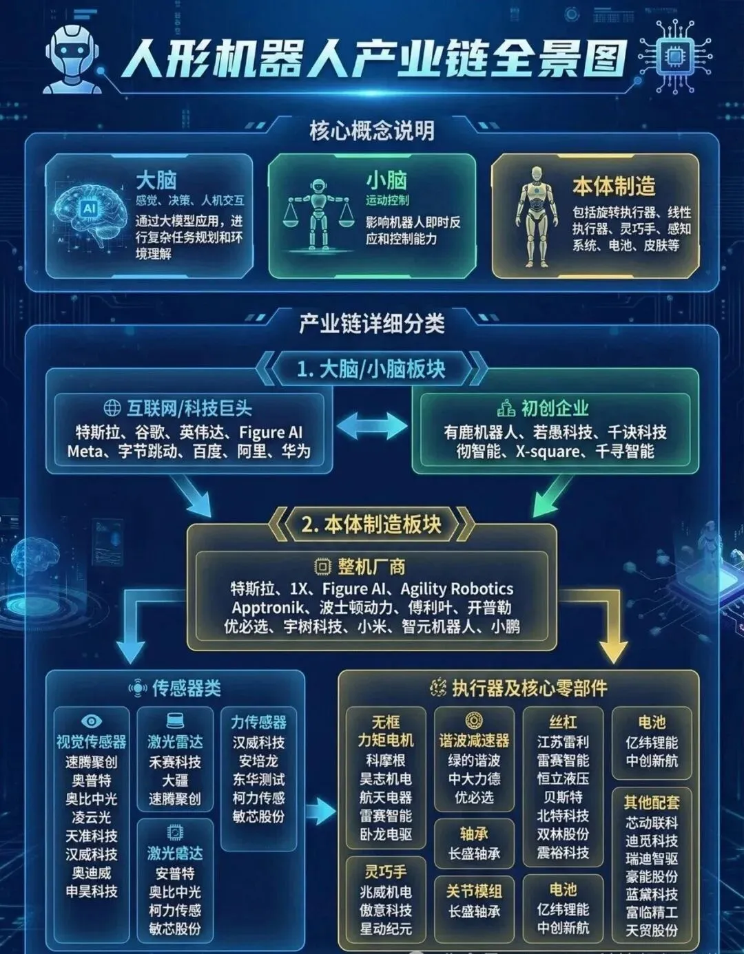 (1)上游(核心零部件):机器人的“心脏”、“大脑”与“骨骼”,占据了整机70%以上的成本。