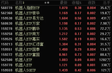 个股选择难度大,适合专业投资者,普通投资者可以优先考虑机器人ETF,同样不会错过机器人产业爆发的大机会,二级市场最全的机器人ETF代码及名称已经统计好,逢低+分批可以关注了