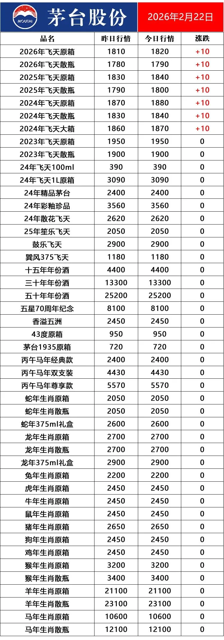 2026年2月22日茅台酒价格行情丨53度飞天茅台酒丨茅台生肖酒丨酱香型白酒表和图片