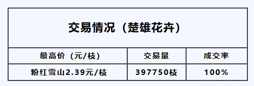 21日,姚安花拍中心全渠道交易总量约为531710枝,今日交易量较前一交易增加,总体购买力上涨。成交率下滑,交易情况如下: