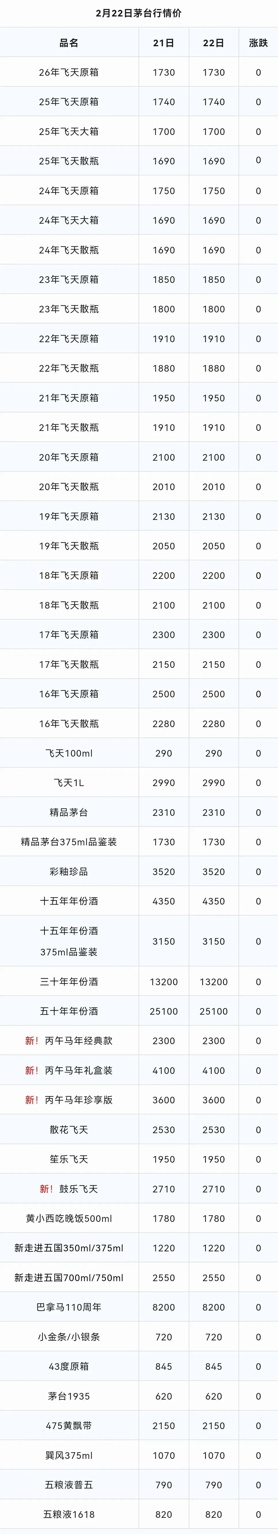 由于公众号平台修改了推送规则,如果不想错过“茅酒顾问”行情价,记得读完点一下“在看”,这样每次新文章推送才会第一时间出现在你的订阅列表里。今日(2月22日),从茅酒顾问发布的白酒价格行情监测数据显示,近段时间整箱茅台价格一直在1550徘徊,散瓶在1540左右,今日53度贵州飞天茅台(500ml)一批价跌至1740元左右!散飞在1690。