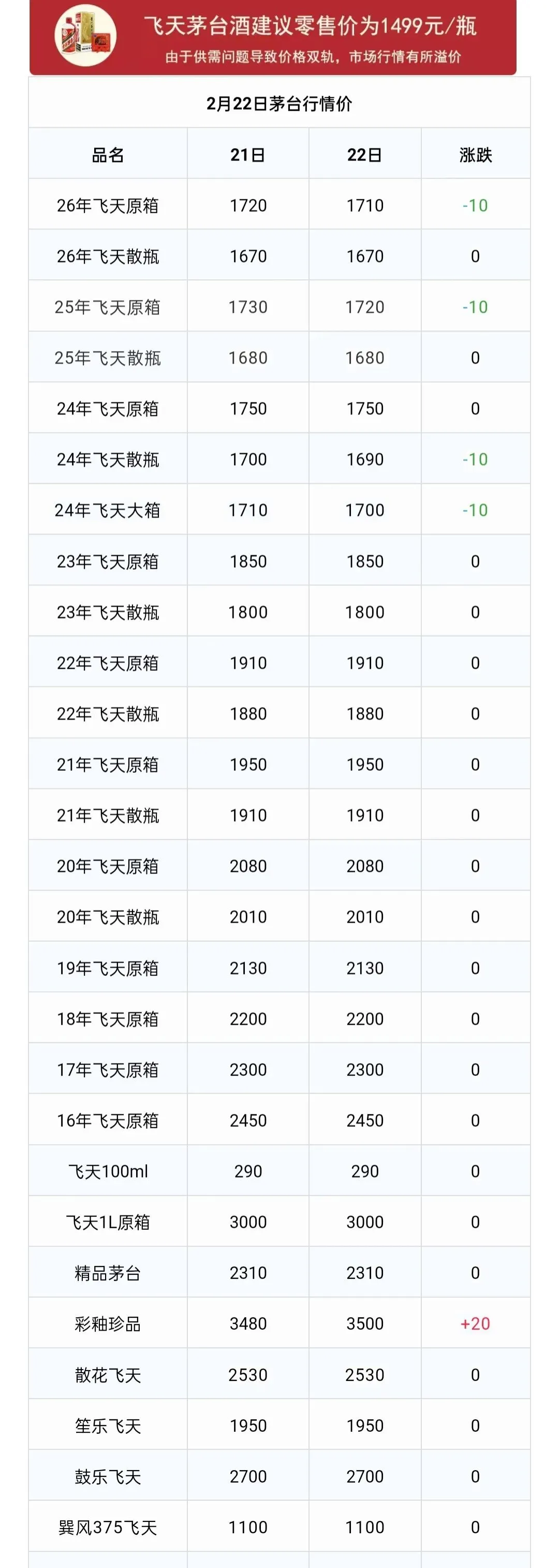 飞天下跌!茅台酒2月22日行情