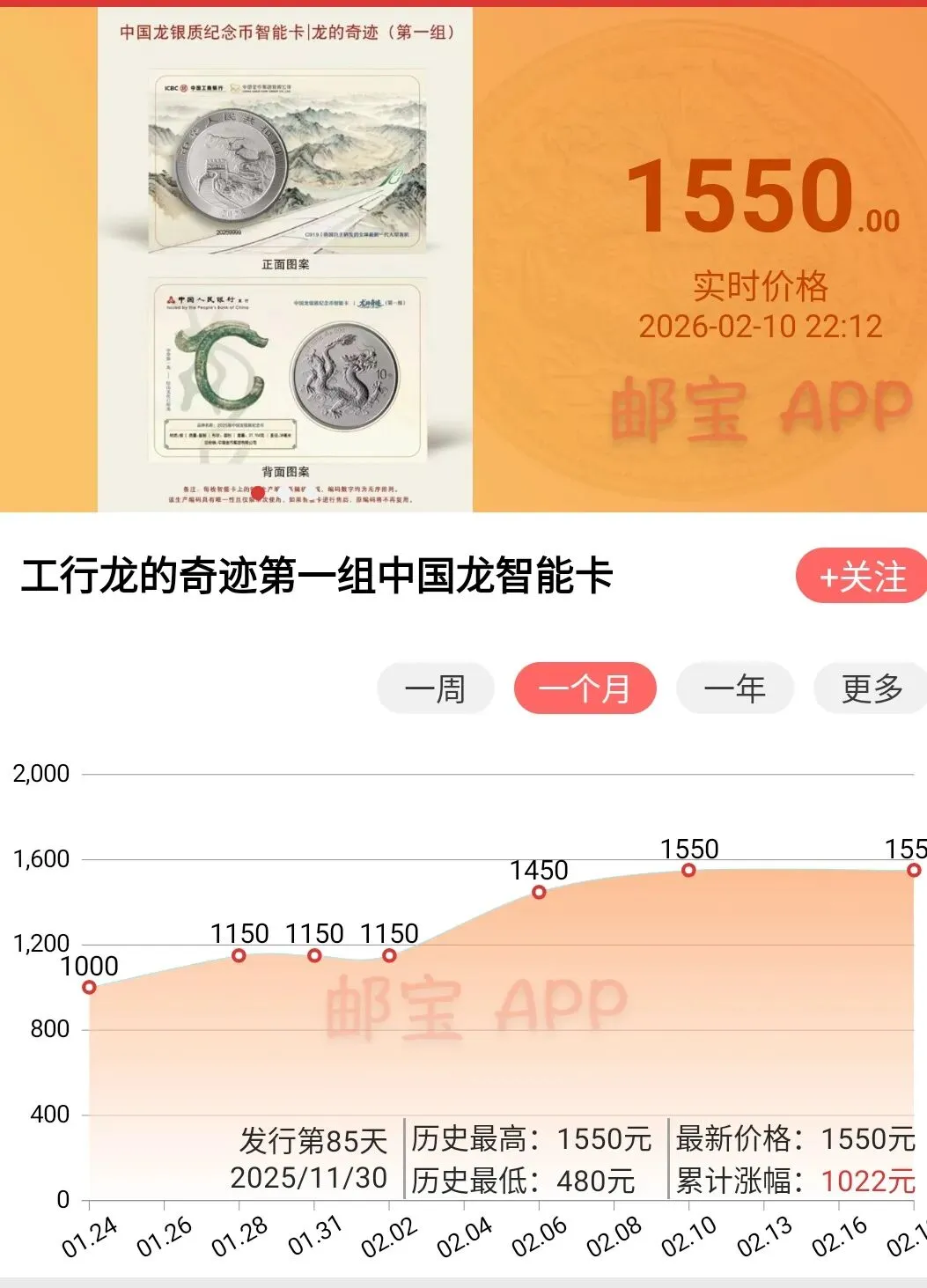 从2025版中国龙银币工行智能卡龙的奇迹最近一段时间市场行情来看,也是有一定的上涨,因为在2月初的时候,市场行情还保持在1150元左右,之后就开启了上涨,到现在已经要1500元起步。