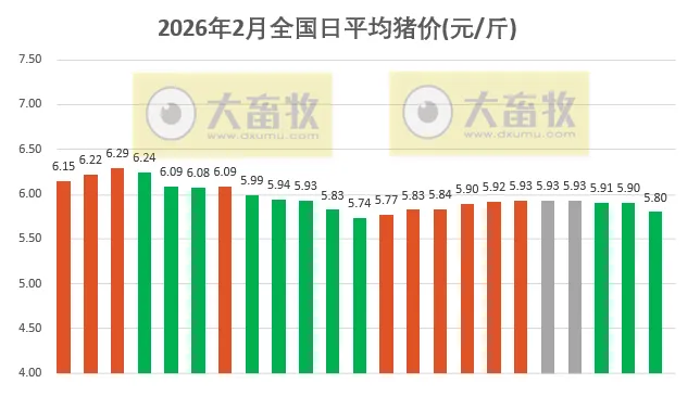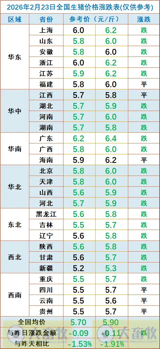 大畜牧小编根据我国27省的猪价数据,计算出2026年2月23日全国平均猪价为每斤5.80元,比昨天下跌0.1元,跌幅为1.7%,连续3天下跌,为近10天最低价;