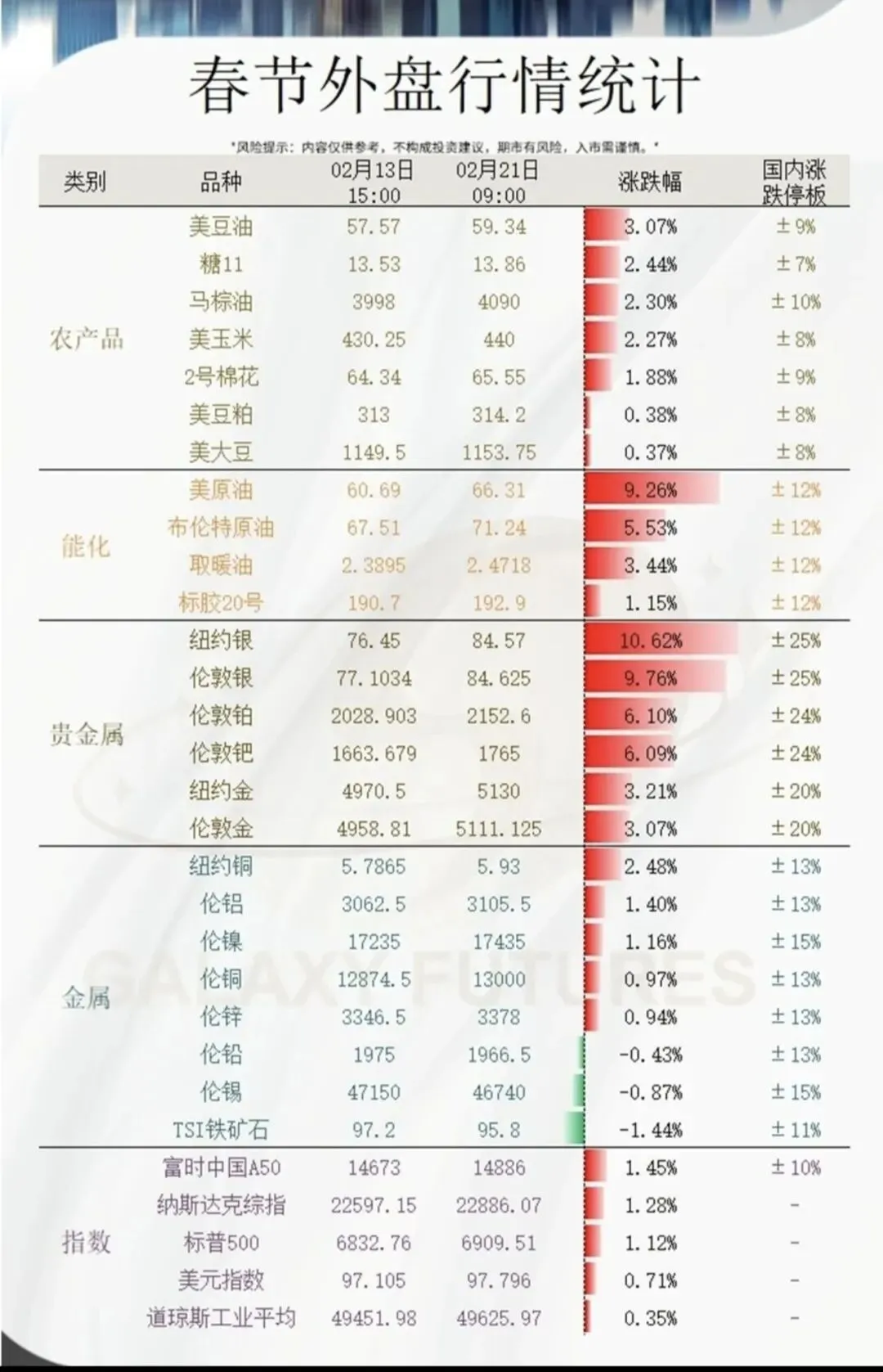 春节一周外盘行情统计如下:比较突出的是,黄金,白银,原油大涨10%。