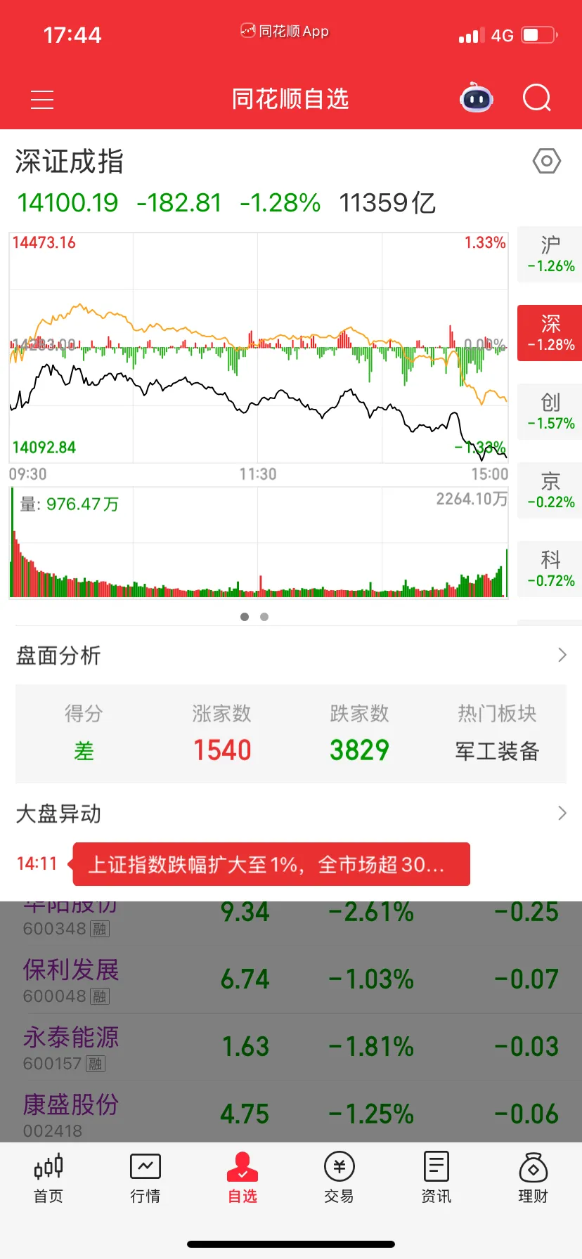 说好的节前“红包行情”,最终却变成了“关灯吃面”。2026年2月14日,A股节前最后一个交易日,三大指数集体收跌,上证指数跌1.26%、深证成指跌1.28%、创业板指跌1.57%,全市场超3800只个股下跌,仅1540只上涨,成交额合计近2万亿元,却难掩兄弟们的失望情绪。