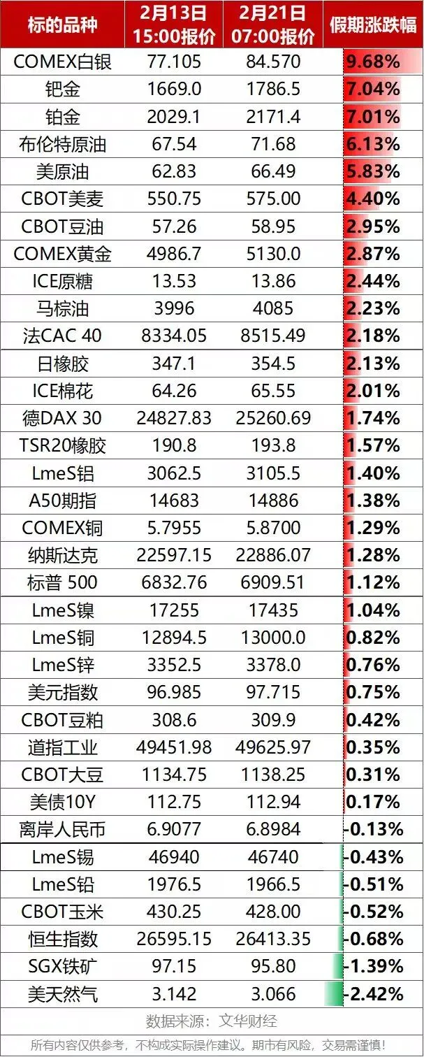 2026年春节假期休市期间外盘商品期货市场行情整体上涨,2026年2月20日,特朗普宣布自2月24日起对全球输美商品加征10%关税,受此关税政策影响,对全球贸易和经济不稳定性风险提高,市场避险情绪提高,直接推升黄金白银等贵金属价格,春节假期国际金价单日突破5100美元/盎司,钯金铂金涨幅超7%,白银涨幅领涨,涨幅达9.68%,受美伊关系不乐观影响,原油强势上涨,假期涨幅超6%,