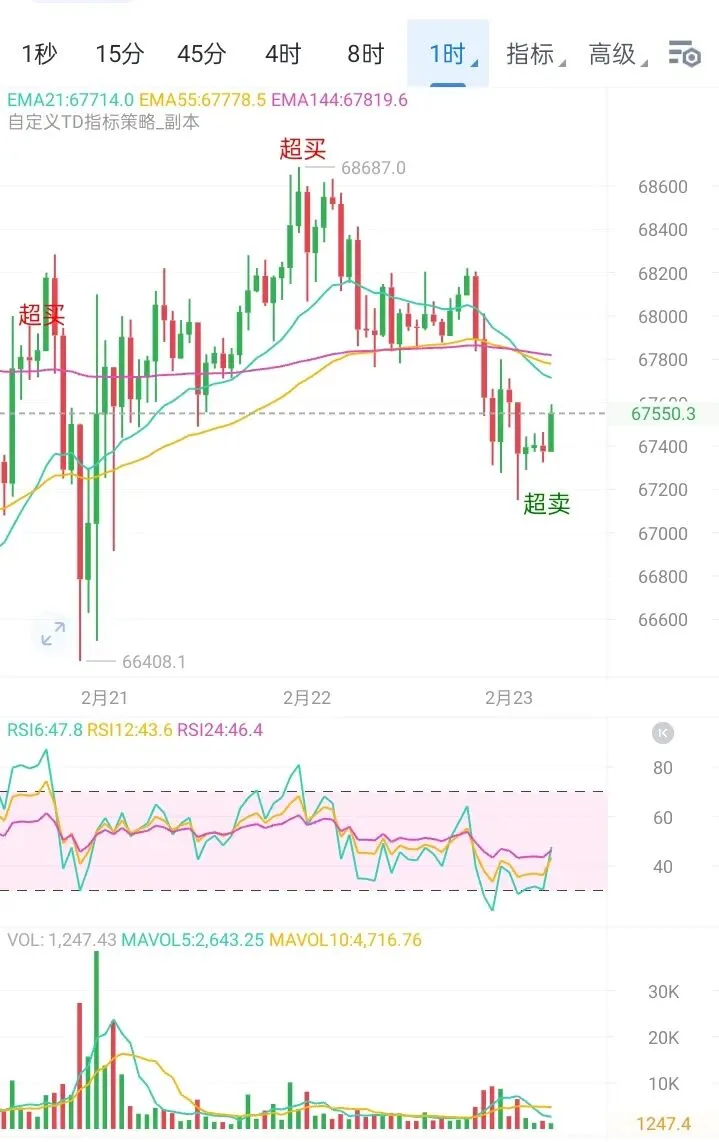 从1小时图观察下跌细节,可以发现下跌过程流畅而反弹乏力,这是典型的弱势特征。K线沿着布林带下轨运行且开口放大,表明空头动能持续释放。短期阻力关注67600-67800区域,下方关键支撑在67200一线,若此位置被再次跌破并确认有效,可能开启更深度的回调。