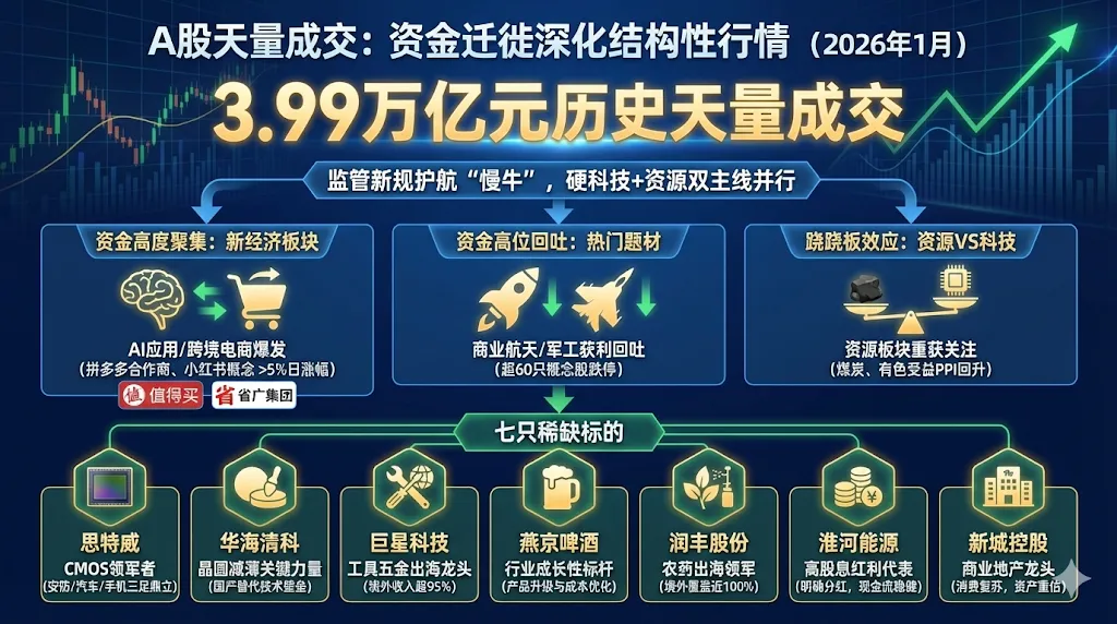 特别声明:投资是一场修行的路,本文所有观点仅代表个人视角的复盘与思考,不构成任何投资建议。市场博弈复杂,请独立思考,自负盈亏。A股市场以3.99万亿元的历史天量成交,宣告了一场前所未有的资金迁徙正在发生。上证指数在创下十年新高后虽现震荡,但日内超百股涨停、AI应用主线批量爆发等现象,清晰地指向结构性行情已进入深化阶段。融资保证金比例上调至100%的新规,是监管层为市场“慢牛”格局铺设的关键轨道。尽管新规对短期情绪造成扰动,但政策仅针对新增融资合约,场内存量资金稳定性未受冲击。在“”与“”并行的政策框架下,科技领域持续获得制度与资金倾斜,资源品则受益于全球通胀预期与能源安全战略,形成“”双主线并行格局。- 一是高度聚集AI应用、跨境电商等新经济板块,拼多多合作商、小红书概念单日涨幅超5%,值得买、省广集团等个股涨停潮印证资金共识;