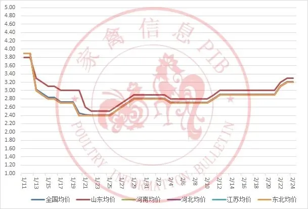 2025年1月11日-2026年2月24日主流地区白羽鸡鸡苗均价走势图