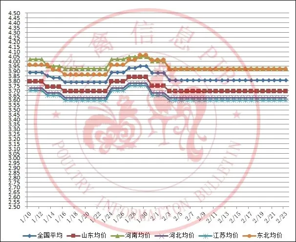 2025年1月10日-2026年2月23日主流地区白羽鸡毛鸡均价走势图