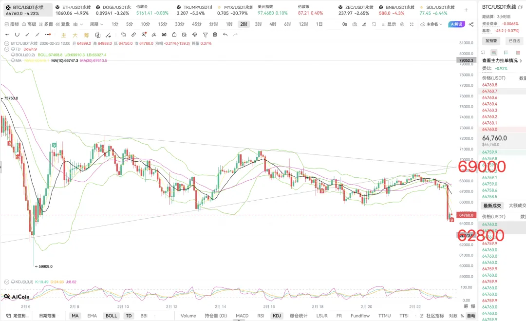 BTC今日行情分析,过年期间BTC整体波不是很大,维持在区间66000-69000内震荡,今日早间BTC下破前期低点65600,最低跌至64300附近。趋势图如图,目前BTC处于三角区间69000-62300内运行,日内操作,上方关注69000附近趋势压制位,建议反弹67800-67500区间即可开仓做空,破位再上看69000附近做空;下方关注63000附近前期低点附近水平支撑,建议回踩63000-63300区间可以做多,破位下看62000附近做多。