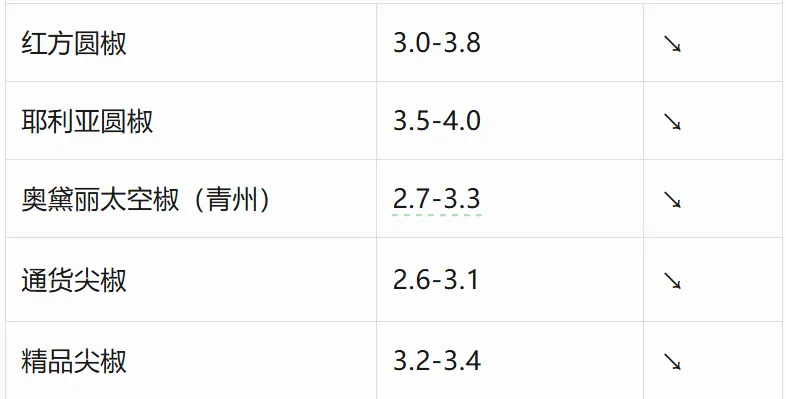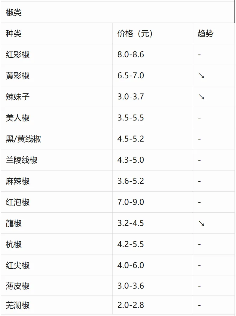 尖椒行情今日价格2.6-3.4元。青州太空椒今日行情2.6-3.3元左右,行情均有下滑,质量参差不齐。龙椒参考3.3-4.5元,一般质量与精品价格差距较大,质量差距大。本地红彩椒8-8.56元,黄彩椒价格6.5-7.0元。西红柿毛粉/硬粉参考价1.6-2.6元左右。