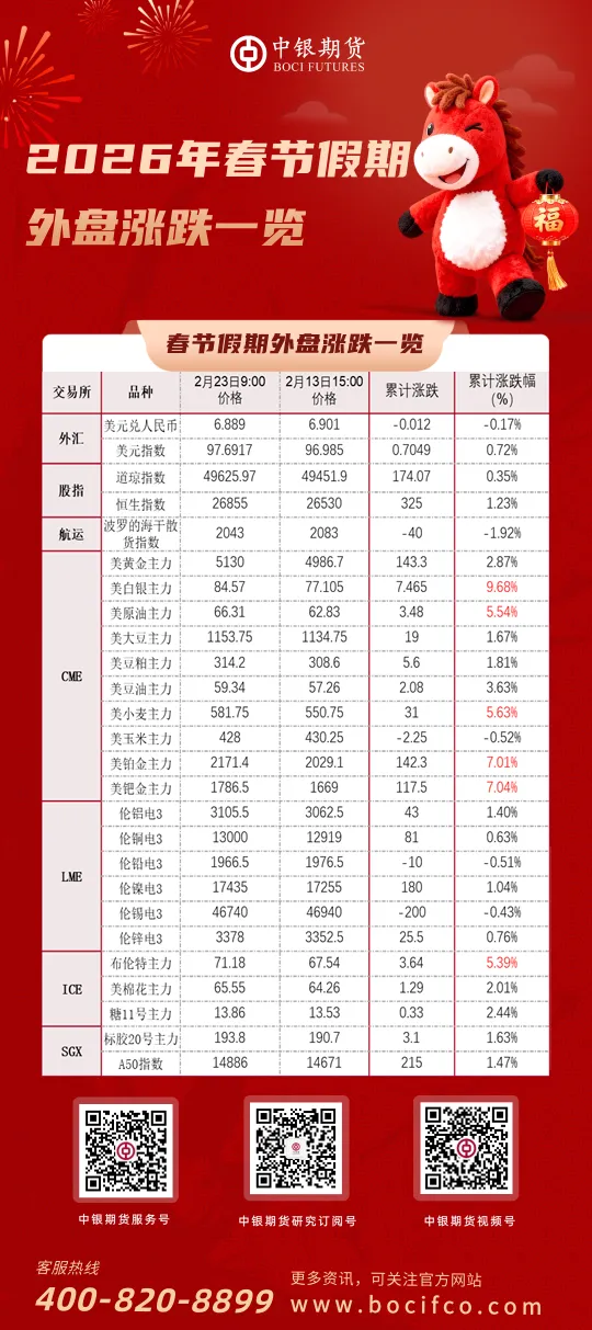 原油:春节假期期间国际油价整体上行,或因地缘情绪再度升温。截至2月20日,外盘Brent原油期货主力合约收报71.24美元/桶,假期累计涨幅约5.48%;WTI原油期货主力合约收报66.31美元/桶,假期累计涨幅约5.54%。伊朗和美国于17日在瑞士日内瓦举行第二轮间接谈判,但双方分歧仍较为显著。同日,伊朗革命卫队在霍尔木兹海峡展开了大规模海军演习,而美国36 架F-16与12架F-22战斗机稍晚抵达美国中东基地,特朗普确认正在考虑对伊朗进行“有限军事打击”。国际宏观方面,美国最高法院于2月20日裁定特朗普政府大规模关税政策违法,该裁决或引发超过1750亿美元的关税退税。特朗普随即宣布将在常规关税基础上对全球商品加征为期150天的10%关税,21日宣布提高至15%。目前美伊局势仍未明朗,考虑到美国内部经济及社会压力较大,其对外地缘问题可能较难完全消解。若后续美伊矛盾激化或爆发实质性冲突,原油绝对价格预计短线冲高,同时伊朗油供应问题将传导至TMX原油、俄油、中东原油现货需求。而若进一步外溢至其他中东国家及霍尔木兹海峡,波斯湾地区原油出口受损将直接影响SC可交割油种货源,不排除SC近月结构剧烈波动的可能性,建议持续关注地缘局势发展动向。观点仅供参考。