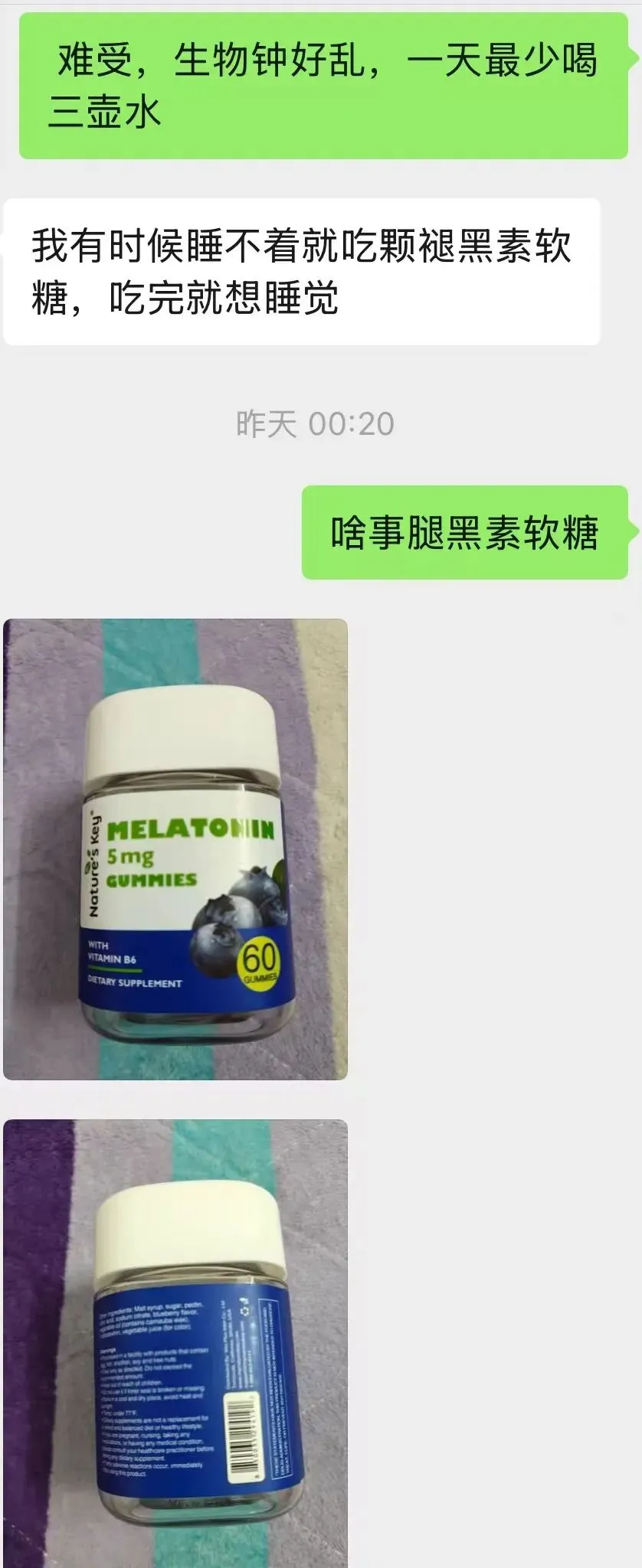 最近认识一个小朋友跟我说,吃褪黑素,20分钟左右就睡着了。我没试过,准备试试。有睡眠问题的朋友也可以试试。