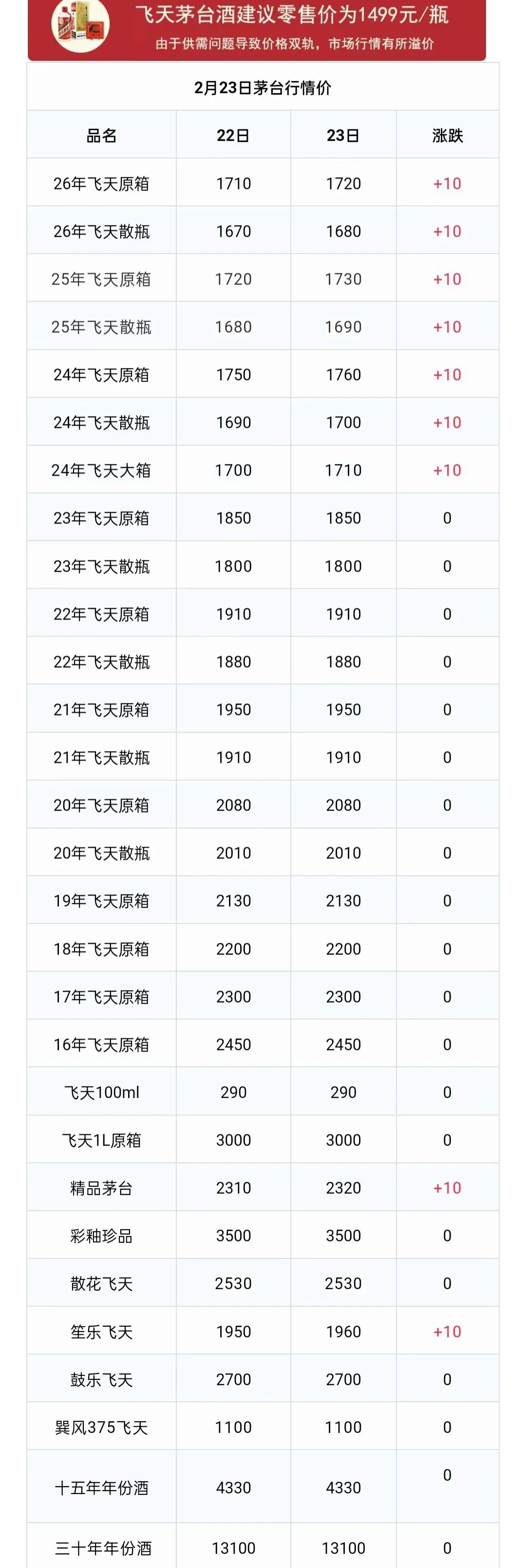 另外,25年飞天茅台也每瓶上涨10元,原箱从昨天的1720元上涨到1730元;散瓶从1680元上涨到1690元。