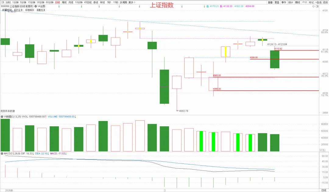 这次春节休市了10天,不确定性较高,年前最后一个交易日市场的避险情绪很浓厚,各指数都是低开后弱势震荡,午后持续下跌,收盘均缩量报收中大阴。休市期间,欧美各重要指数涨跌不大,香港恒生指数和恒生科技指数均有较大涨幅,只要今晚美股那边没有出现超预期利空导致的暴跌,明天A股小幅高开的概率较大。