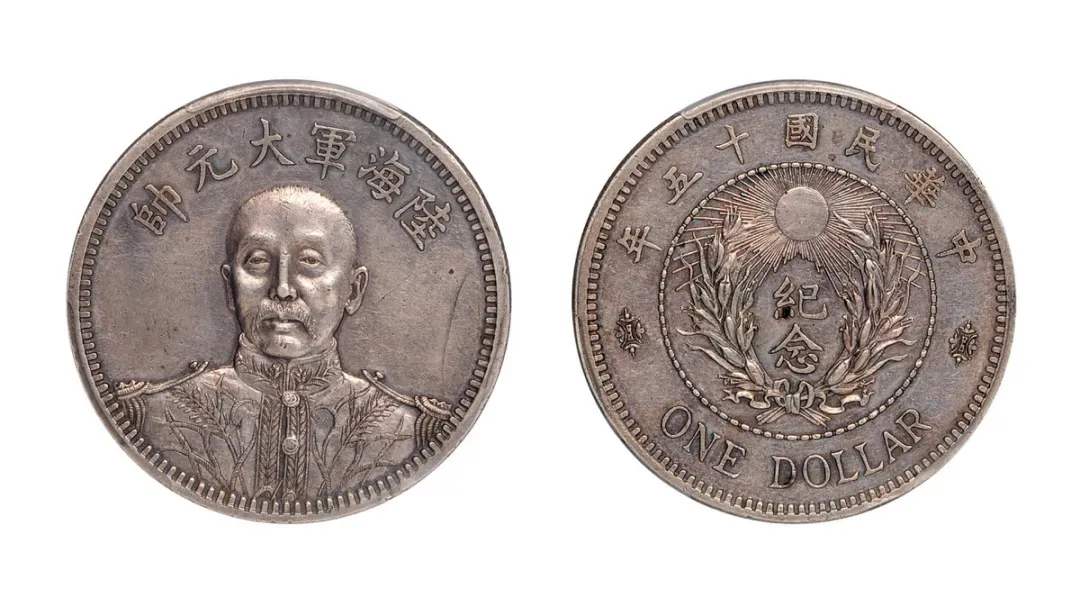 民国十五年张作霖戎装像陆海军大元帅纪念银币样币一枚,天津造币厂试铸,还曾铸有民国十六年、十七年大元帅纪念币,均未发行,存世仅见样币,其中,以十五年样币最为稀少,此枚雕刻精美,铸工精湛,堪称中国近代人像币铸造之典范,币面呈浅灰色,原始包浆均匀,银光犹存,品种极为难得。