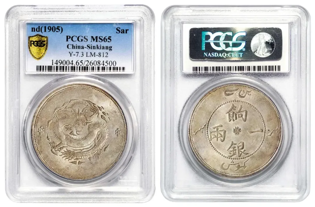 1905年新疆饷银一两银币一枚,正面回文版,此枚打模深峻,齿边锋利,版底同心圆铸纹清晰,制作精美绝伦,品相出众。