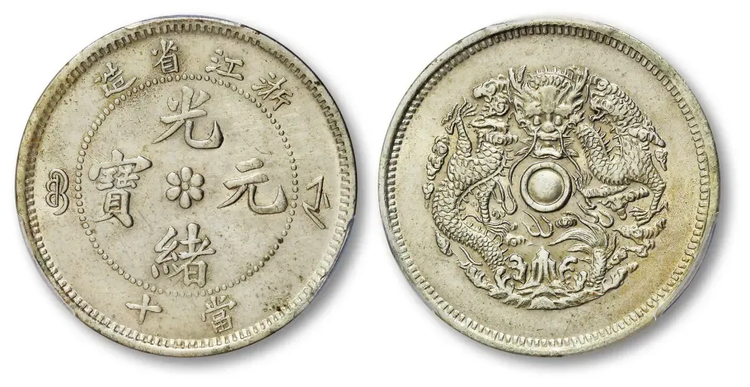 1903年浙江省造光绪元宝当十白铜样币一枚,满文小B“宝”版,仅试铸,未发行,目前已知包括此枚存世仅二枚,另枚曾为伍德华旧藏,于2008年香港诺曼·雅格斯专场拍卖会拍出,伍德华在伍谱最后之增补篇才将此样币收录其中,可见其稀少程度非比寻常;周沁园、李平文编著《中国机制铜元目录》中,亦将此币列为一级品;样币铸造精良,压印深峻,图文近乎满打,铜光姣好,品相相较另枚亦更胜一筹,无疑是为浙江铜元顶级珍品。