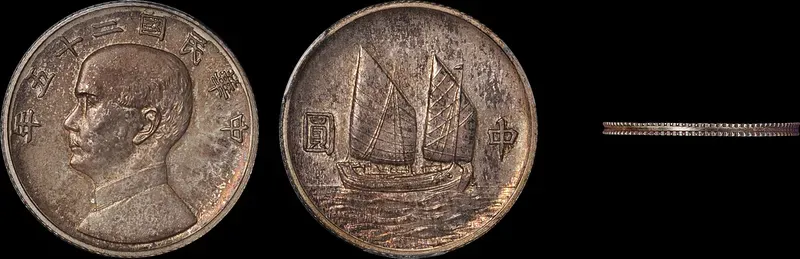 民国二十五年孙中山像背帆船中圆小型银币样币一枚,凹槽边,铸工精美,是船洋试铸样币中最稀少的品种,极为珍罕。