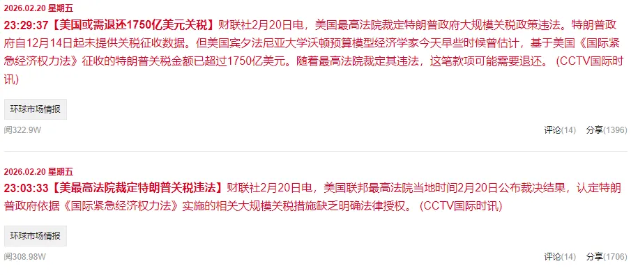 第一个重磅新闻就是特朗普去年依据《国际紧急经济权力法》加征的10%关税被美国最高法院判定为违法,美国海关部门将于2月24日停止征收相关关税。