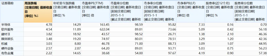 1. 从行业板块来看,本周35个行业中18个上涨,17个下跌。半导体和软件服务涨幅均超4%,位居前2位;建材、媒体娱乐、机械行业紧随其后,涨幅超3%;硬件设备和有色上涨超2%。