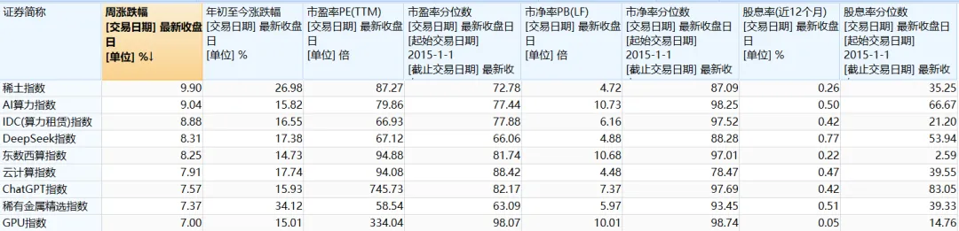 2.从概念板块看,稀土以及人工智能相关概念位居涨幅榜前列,稀土指数、AI算力、IDC、DeepSeek、东数西算、云计算、ChatGPT、GPU等概念涨幅均超过7%。
