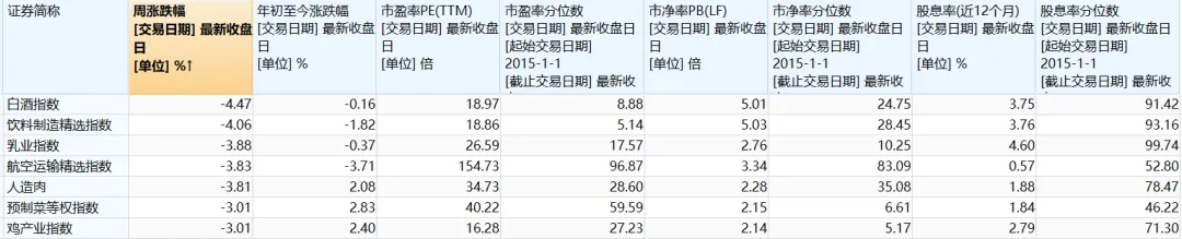 跌幅榜方面,日常消费零售下跌3.83%,其他纺织服装、家庭用品、食品饮料、电信服务下跌约2%。