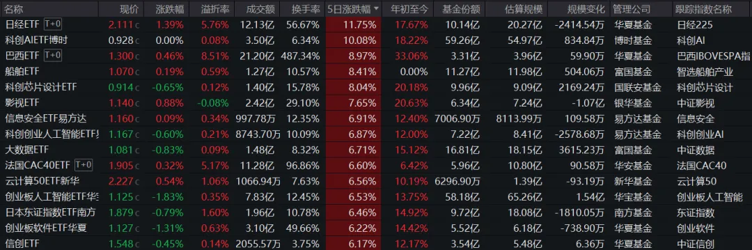 节前一周,位居涨幅榜前列的ETF主要是跨市场和科技(AI、软件、信息等)两大类。跨市场主要是日经、巴西、法国CAC等市场的ETF,科技类主要是AI、芯片、信息安全、大数据、软件、信创等主题ETF。