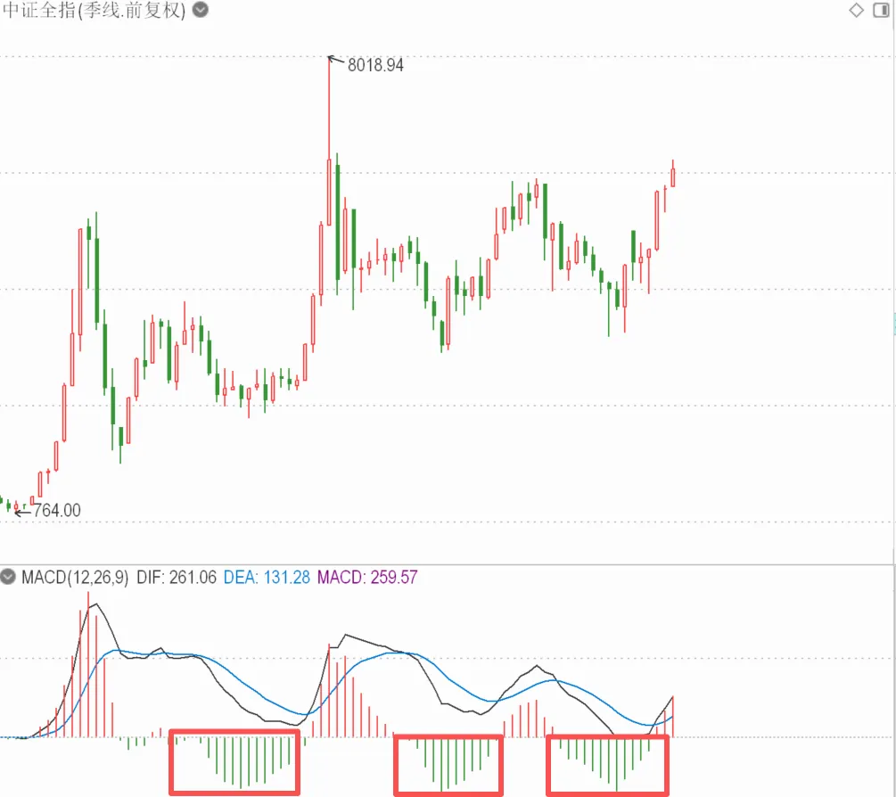 DEA和DIF不能进入水下,macd不能出线大片的绿柱,季线