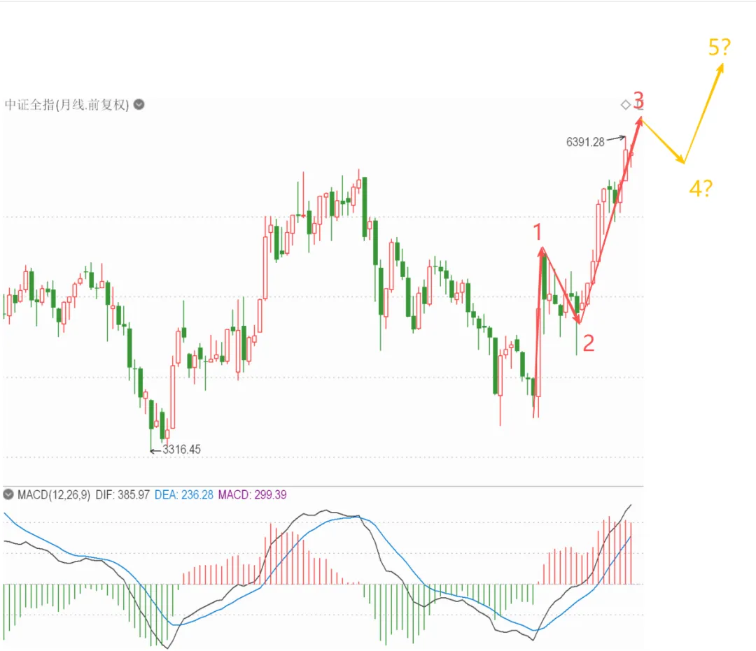前面扯的有点多,回到当下的指数从结构上来说是非常确定的,就是已经走完了1浪和2浪,3浪(主升浪)也走出来了,但3浪是不是结束了目前还看不出来,至于后面有没有4浪和5浪,或者在当下的级别的基础上又发展为其他的非标准结构,那就是无法预料的了。