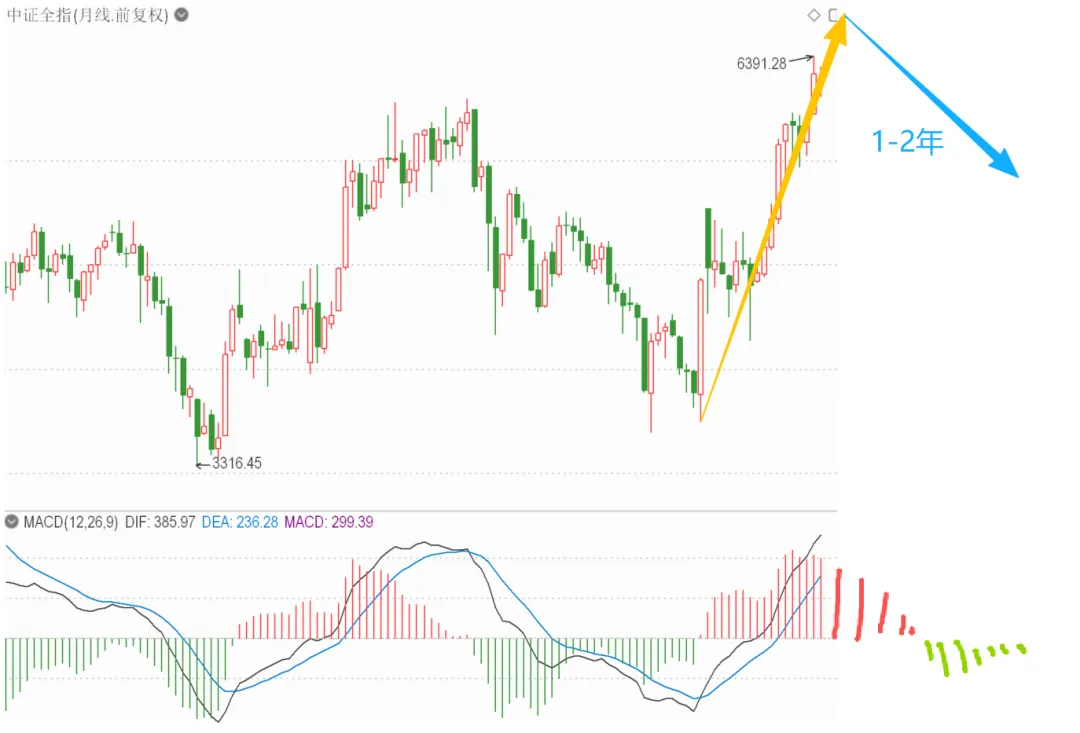 从中证全指历次牛市结束后的下跌来看,无一不是持续3年左右的大熊市,从月线macd来看就是DEA和DIF进入到水下,并且出现大片绿柱,从季线macd来看就是